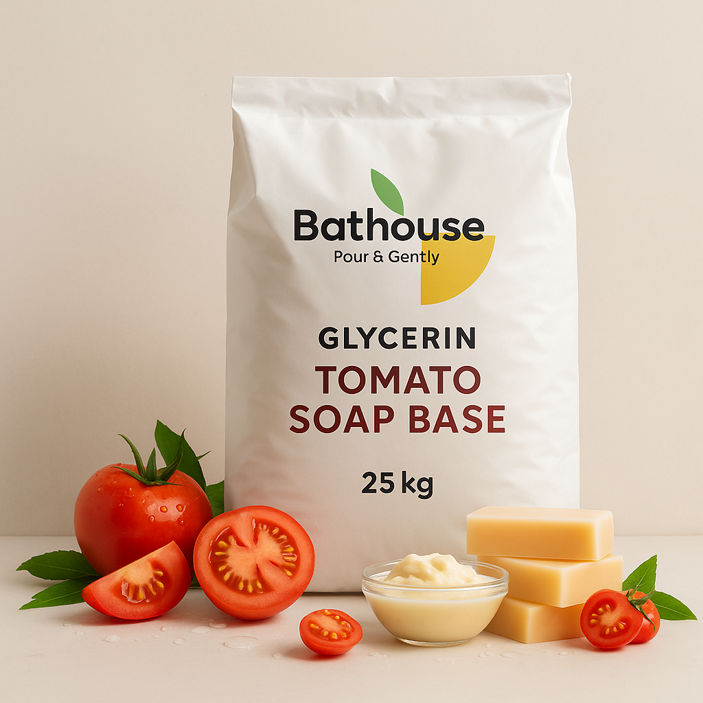 Infused with the natural richness of ripe tomatoes and the moisturizing benefits of glycerin, the Bathouse Glycerin Tomato Soap Base is designed to create soaps that deliver freshness, nourishment, and a radiant glow. Tomatoes are packed with antioxidants like lycopene, known to fight free radicals, brighten dull skin, and support an even complexion.